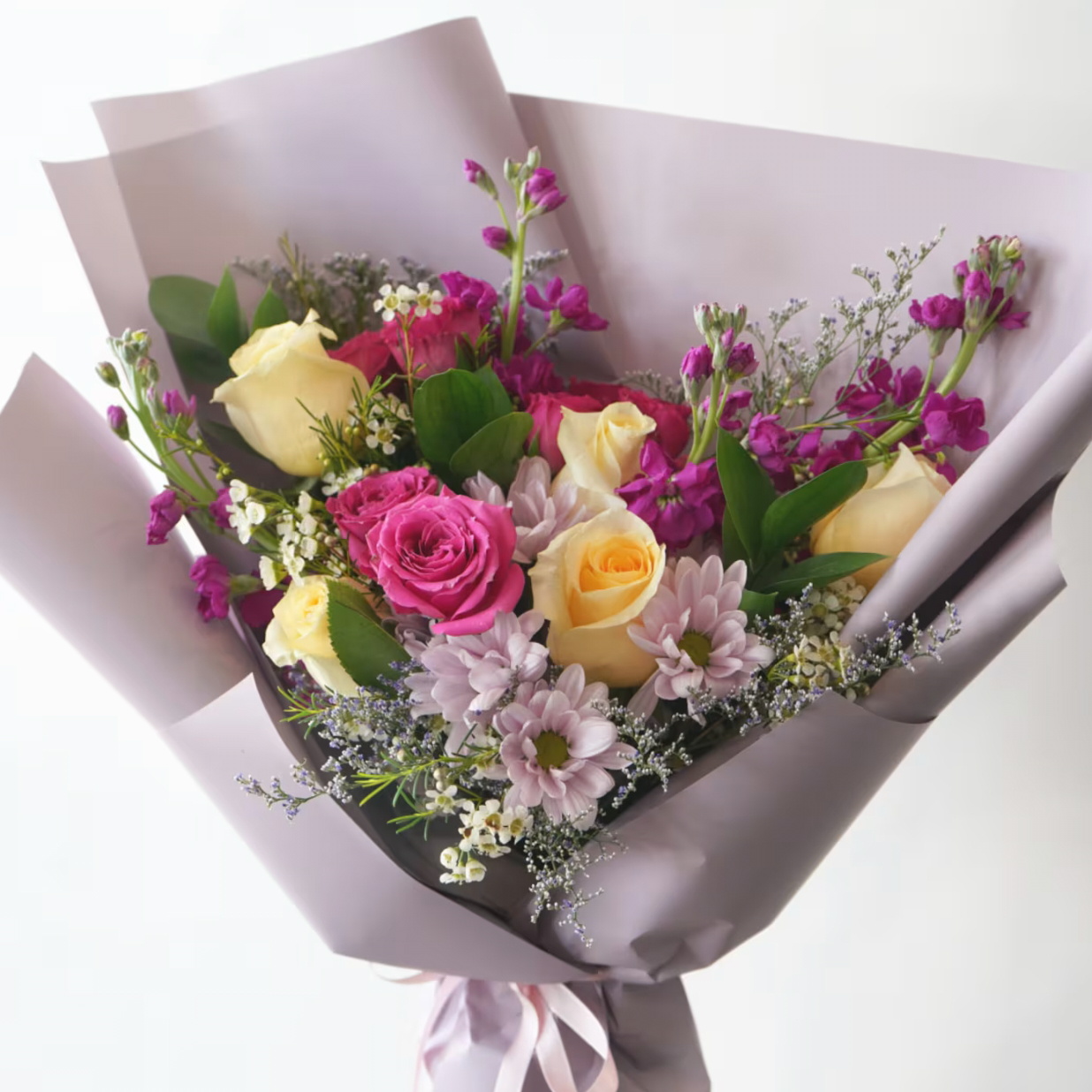 Violetse tooniga lillekimp kaunite rooside, preeriakellade , lõvilõugade koosluses.