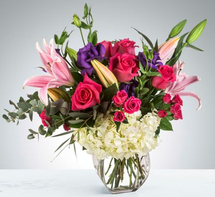 Erk-roosade rooside, valgete hortensia ja liiliate kooslus